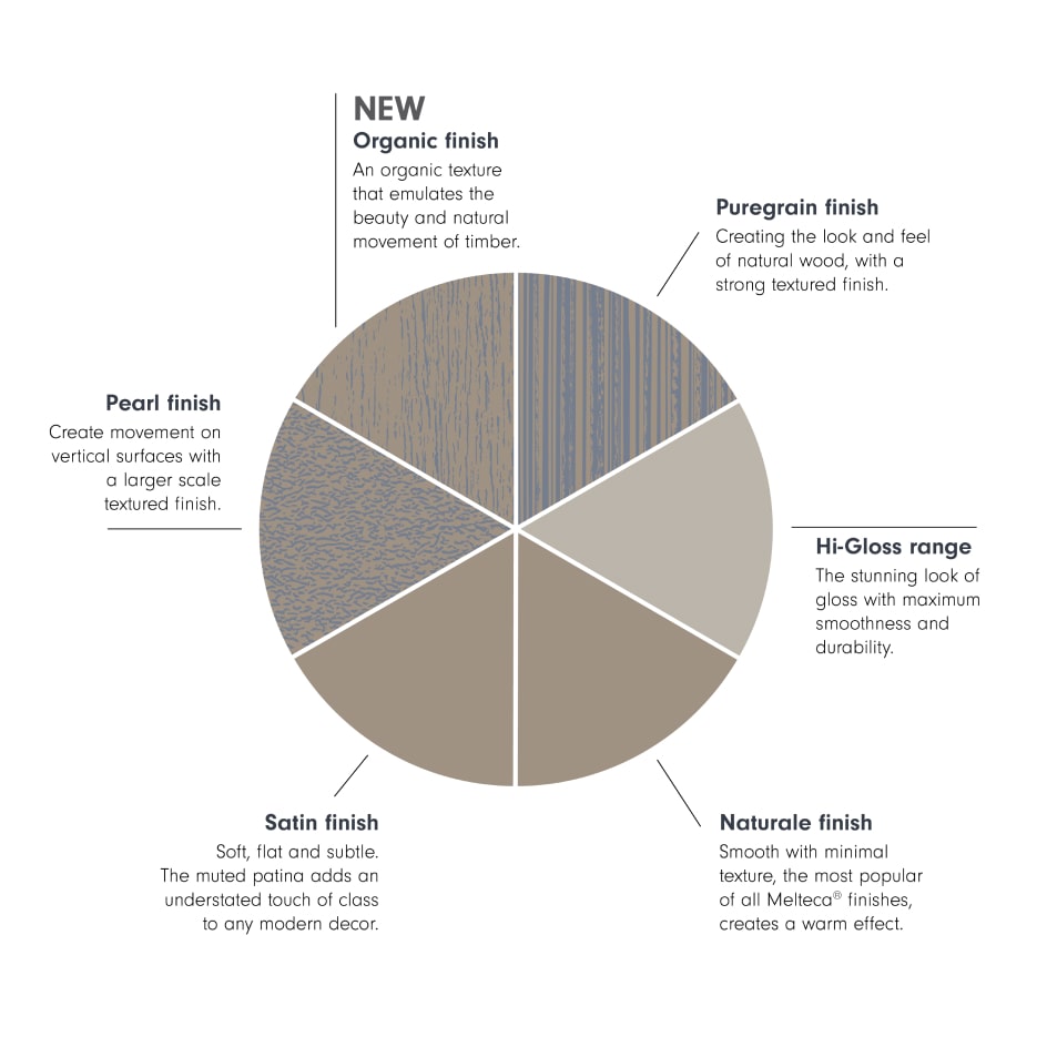 Melteca is available in a number of finishes allowing you to add another dimension to your space, through both visual and tactile sensations. Our standard colour range is available in Naturale, Satin, Pearl, Puregrain and our new Organic finish. For an added touch of luxury our Hi-Gloss range will add a shine to a selected number of decors.