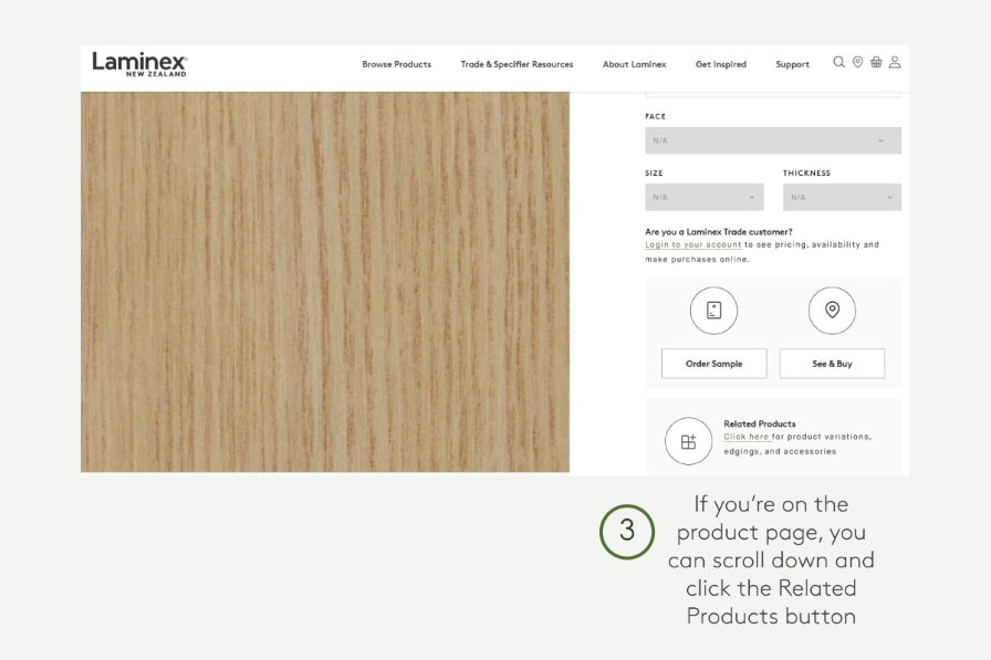 No need to sign in or create an account - simply visit Laminex.co.nz, search for a product and click the button called "Related products". All of our products with a SKU are represented – if you can’t find the Melteca you are looking for – we may be able to create it for you.