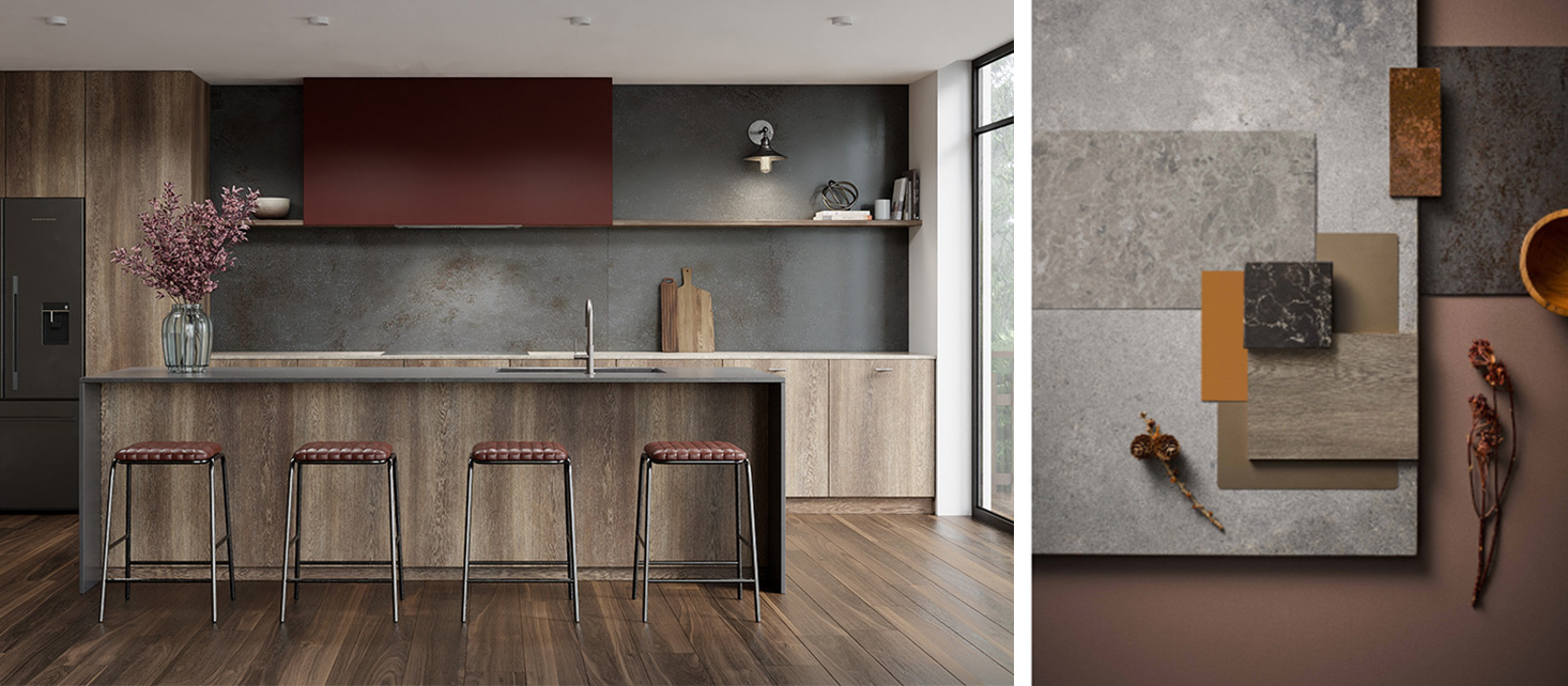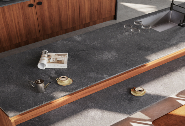 From left to right: 1. Caesarstone Rugged Concrete Benchtop 2. Laminex Formica Laminate Kalamata