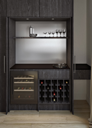 From left to right: 1. Benchtop: Laminex Formica Laminate Nero Grafite 2. Benchtop: Laminam Noir Desir, Cabinetry: Melteca Oiled Legno 4. HIMACS Aurora Sanremo 5. Cabinetry: Melteca Shou Sugi